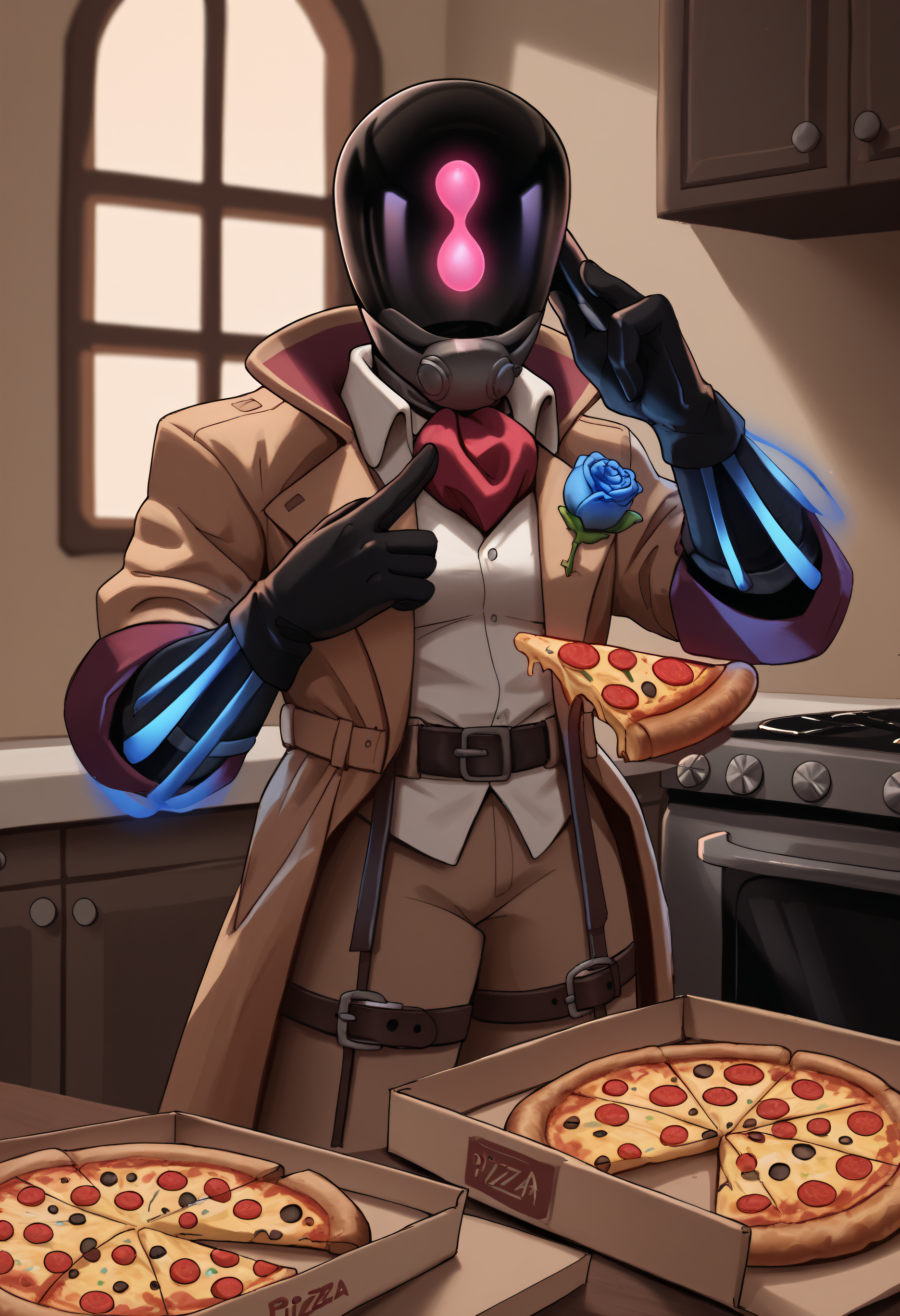 Clothes: trench coat, high collar, white shirt, red ascot, blue rose, belt, gloves, black pants, thigh boots, cable