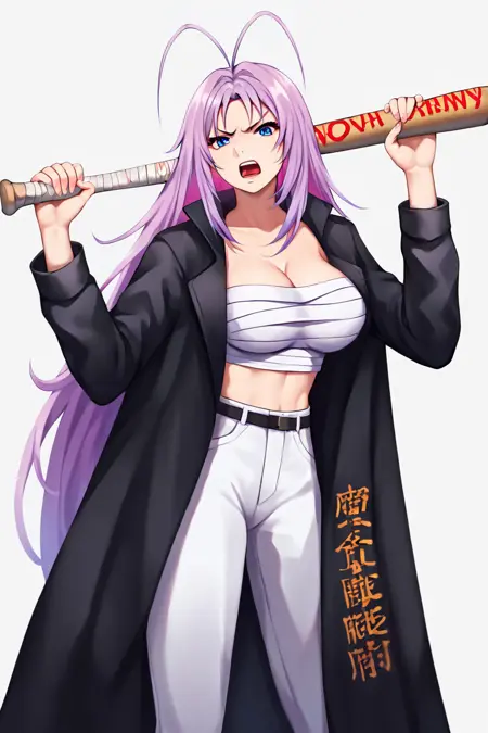 站姿、长外套搭配木刀提示:不良少年、女暴走族、站立、愤怒、张嘴、白外套、长外套、胸缠布、胸带、白裤子、木刀、手持刀、刀扛在肩上