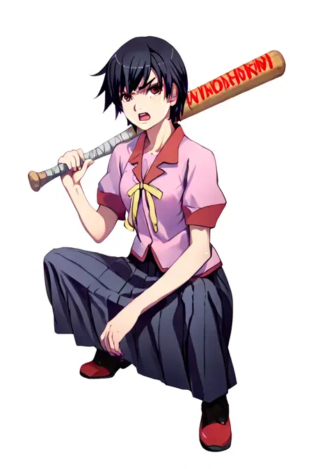 蹲姿、校服搭配棒球棒提示:不良少年、女暴走族、蹲姿、愤怒、张嘴、黑色校服、长裙、黑裙、黑鞋、棒球棒、手持棒球棒、棒球棒扛在肩上