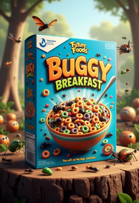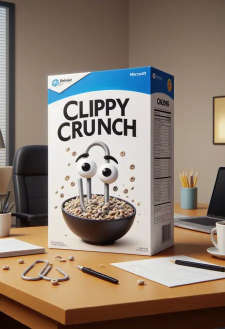 前景には、(THINGS)で満たされたシリアルのボウルが置かれ、ミルクが縁からこぼれ落ちている様子が見えます。ボウルは粗く温かみのある木製のテーブルの上にあり、シーンに質感と暖かさを加えています。ボウルの周囲には散らばったシリアルの破片があり、豊かさと新鮮さを強調しています。