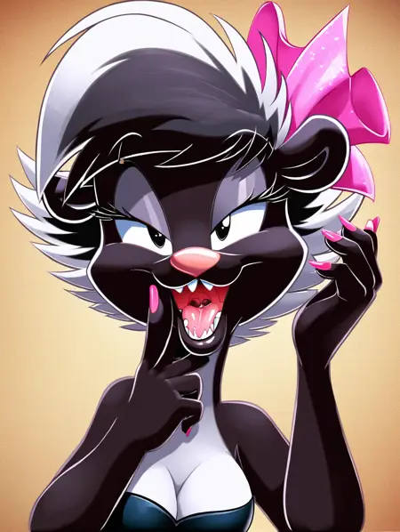 tracey tailor,skunk,short hair,traceyhair,two-tone hair,black hair,white hair,traceys hair ornament,medium breasts,,black eyes,long eyelashes,