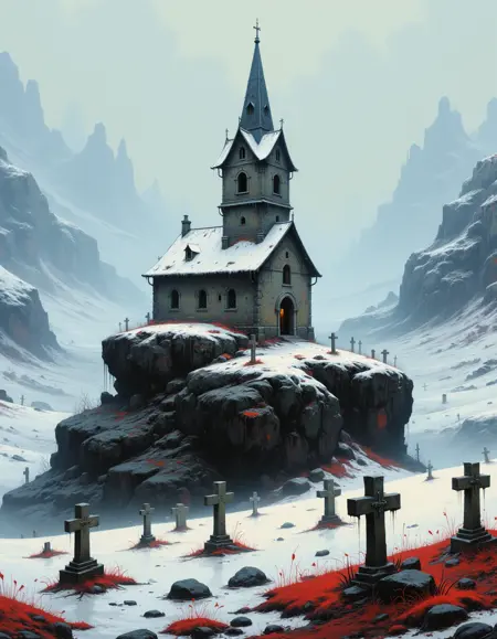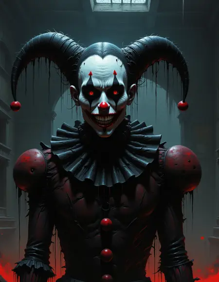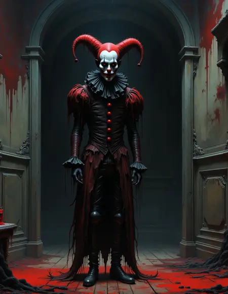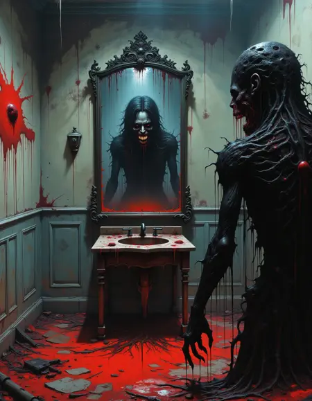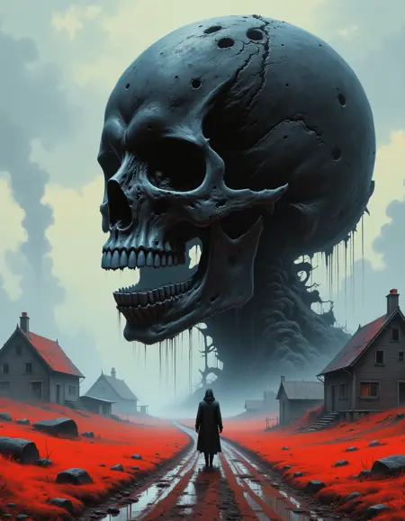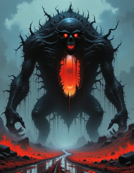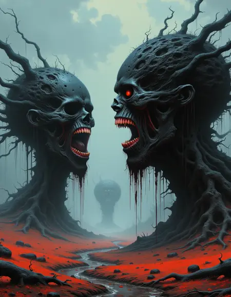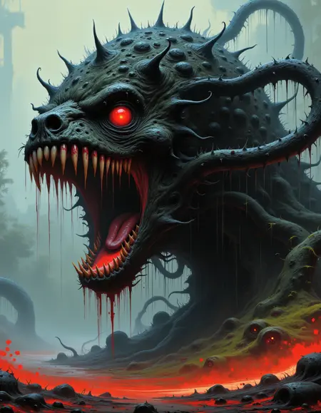 The Horror Show style emphasizes a dark, surreal, and often grotesque atmosphere, blending eerie, otherworldly creatures with ominous, apocalyptic landscapes. The style thrives on exaggerated forms, intense contrasts between light and shadow, and a vivid, almost nightmarish color palette dominated by reds, blacks, and muted tones. It evokes a sense of dread and suspense, with an emphasis on monstrous entities and unsettling environments that seem to pulse with malevolent energy. The overall effect is both visually striking and deeply unnerving, immersing viewers in a macabre and terrifying world.