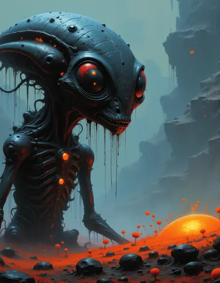 Horror Show 스타일은 어둡고 초현실적이며 종종 괴상한 분위기를 강조하며, 기괴하고 초자연적인 생물들과 위협적인, 종말적인 풍경을 결합합니다. 이 스타일은 과장된 형태와 빛과 그림자 사이의 강렬한 대비, 붉은색, 검정색, 그리고 침착한 톤으로 구성된 생생하고 거의 악몽 같은 색채 팔레트에 기반합니다. 이는 끔찍함과 긴장감을 불러일으키며, 악의적인 에너지로 뛰는 듯한 괴물 같은 존재와 불안한 환경을 강조합니다. 전체적인 효과는 시각적으로 강렬하면서도 깊이 불안하게 만들어, 관객을 괴기스럽고 공포로 가득 찬 세계에 몰입시킵니다.