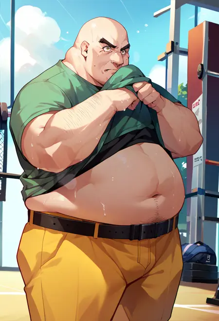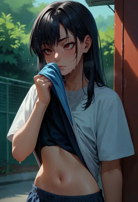 wiping face, wiping sweat, lifted by self, shirt lift, shirt, sweat