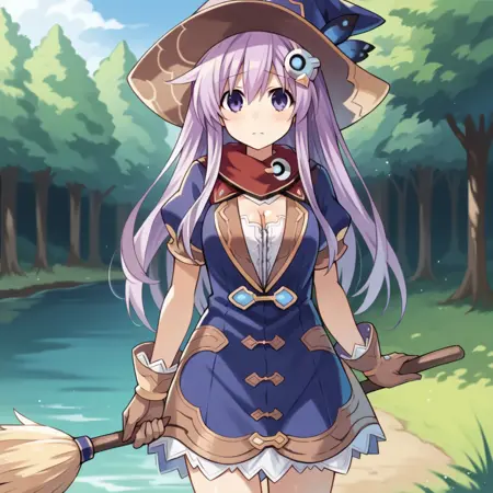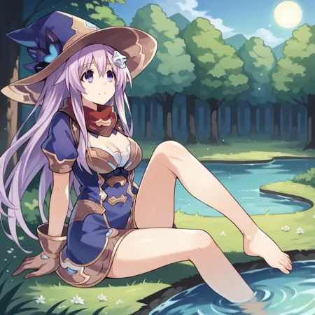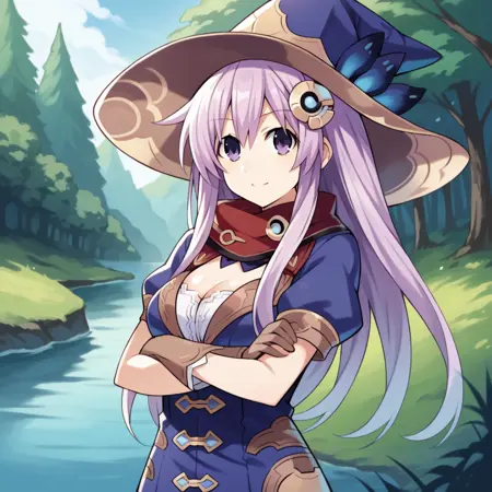 NpGr, Fol001, Np_Wch, 紫发, 紫眼, nepgear, 长发, 女巫帽, 发夹, 红色围巾, 白色衬衫, 暴露胸部, 衬衫, 蓝色连衣裙, 连衣裙, 蓬松短袖, 棕色镶边, 蓝色袖子, 白色裙子, 裙摆内衬, 裙子, 棕色手套, 手套, 金色手镯, 蓝色靴子, 帽子上的蝴蝶, 蓝色蝴蝶,