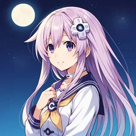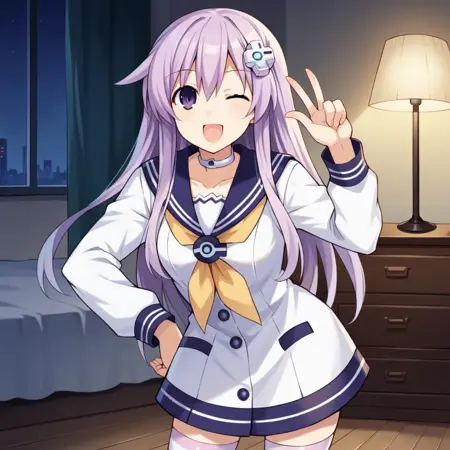 NpGr, Fol001, Np_Def, 紫发, 紫眼, nepgear, 长发, 水手服, 白色连衣裙, 紫色水手领, 黄色领巾, 白色长袖, 紫色袖口, D-pad发饰, 白色项圈, 紫色镶边, 大腿枪套, 条纹长筒袜, 白色长筒袜, 粉色长筒袜, 短靴, 白色鞋履,
