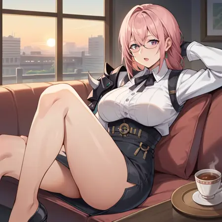 ショルダーストラップ, メガネ, アンダーリムメガネ, 白いシャツ, ポロシャツ, 長袖, 白い袖, 肩アーマー, 黒い手袋, 黒いスカート, ペンシルスカート, ベルト, 高めのウエストスカート, 首リボン, 黒いリボン, 裸の足, 黒い靴, ヒール,