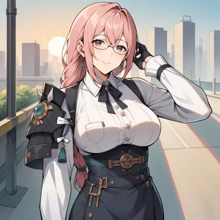 어깨스트랩, 안경, 언더림 안경, 흰색 셔츠, 칼라 셔츠, 긴 소매, 흰색 소매, 어깨 갑옷, 검정 장갑, 검정 치마, 연필 치마, 벨트, 고위스 치마, 목 리본, 검정 리본, 다리 노출, 검정 신발, 하이힐,