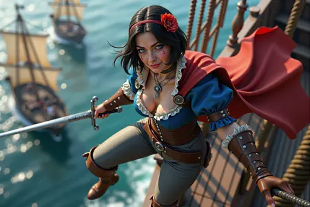 아름다운 해적 여전사가 단순히 너무나 섹시한 탓에 모든 이의 시선을 끈다. 스파이크가 박힌 가죽 갑옷을 입고, 이중 칼을 휘두르는 여전사, 시선을 향해 어깨를 돌아보며, 가슴 부분에 초점, 라피어와 메인 고쉬를 한 손에 각각 들고, (D&D 전사 여성 도적 암살자 해적으로서의 백설공주:1.1), Raid Shadow Legends의 미나야에서 영감을 받음, 판타지 복장, 중세 옷차림, 머리는 옥처럼 검고 피부는 눈처럼 희다, (중앙으로 갈라진 단발 머리), 빨간 머리띠에 큰 붉은 카네이션, 밝은 청색 반사 눈동자, 교활한 미소, (파란 부풀어 오른 소매에 빨간 끈 자국), 짧은 빨간 망토, 허리에 플린트락 총, 넓은 골반, (닳고 뜯긴 스트레스 처리된 회색 가죽 슬림 팬츠), 높은 흰색 칼라와 주름진 흰 레이스 가장자리가 있는 파란 천 재킷, 은색 목걸이에 펜던트, 갈색 가죽 팔보호대, 갈색 가죽 끈, 새겨진 은색 펜싱 팔찌, (박힌 갈색 가죽 코르셋), 가슴이 크고 운동선수 같은 체형, 가슴, 무릎까지 오는 부드러운 갈색 가죽 하이힐 부츠, (섹시:1.2), 놀라운 여성적 형태, 민첩하고 기민하며 빠르다, (죽음의 암살자), 교만하고, 눈짓, 여우같이, 역동적인 액션 포즈, 유혹적이고 매력적이고, 어둡고, 신비롭고, 야망에 찬