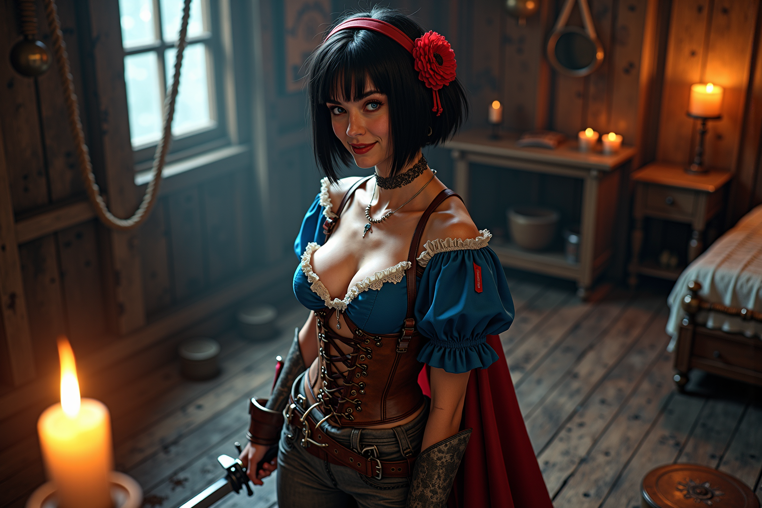 미나야(섹시한 해적 백설공주)를 더 많이 원하신다면, 제가 잘 작동했던 프롬프트 예시입니다: