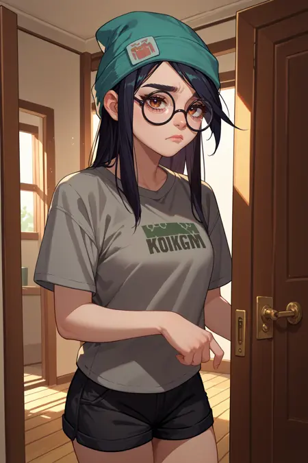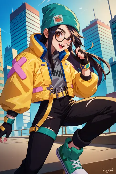 그녀의 전형적인 외모를 위해 "녹색 비니, 녹색 모자, 둥근 안경, 노란 재킷, 회색 셔츠, 부분적으로 손가락이 없는 장갑, 노란 벨트, 검은 바지"를 추가하세요.