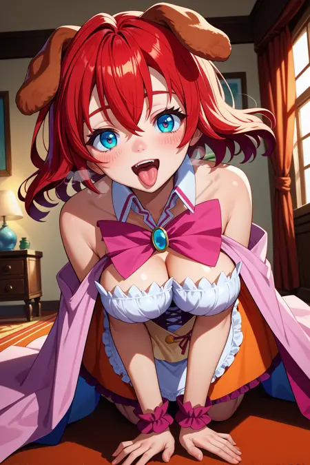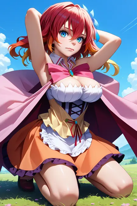 그녀의 전형적인 외모를 위해 "머리 꽃, 분리형 칼라, 분홍색 리본, 분홍색 망토, 어깨 노출, 흰색 드레스, 가슴 노출, 코르셋, 흰색 앞치마, 주황색 치마"를 추가하세요.