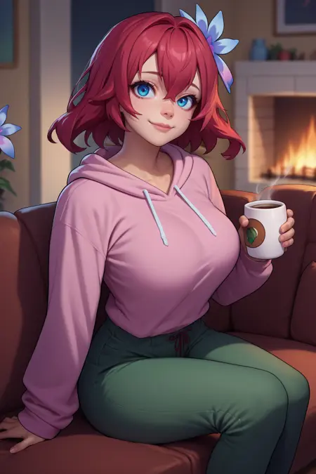트리거 단어는 "sdola"이며, "빨간 머리, 중간 길이 머리, 파란 눈"이 필수입니다.