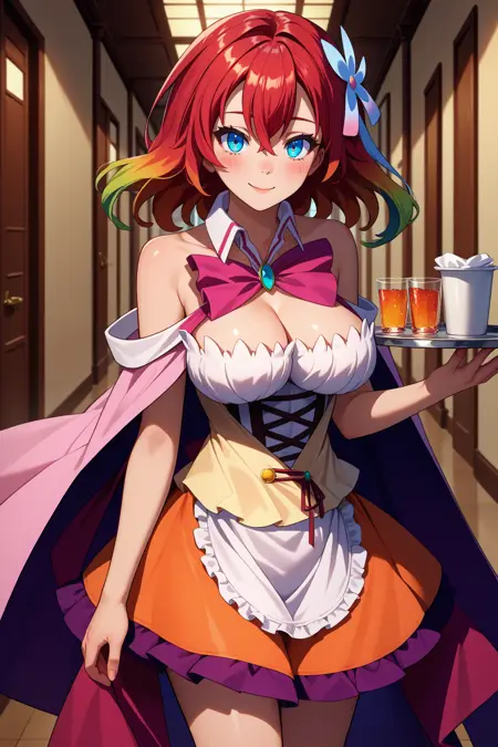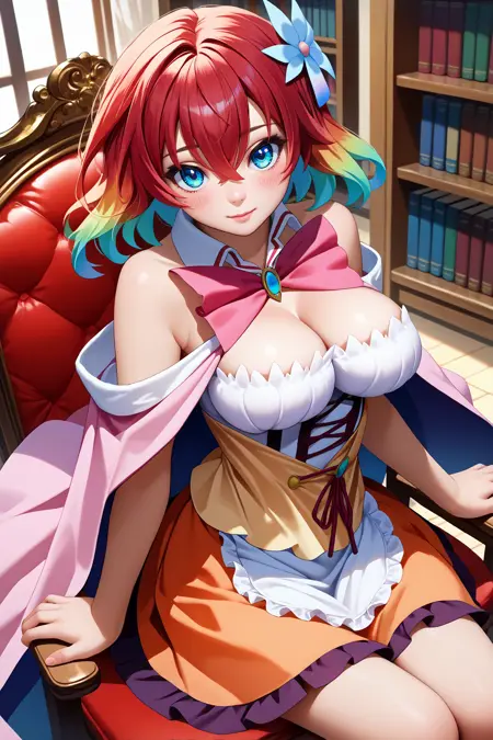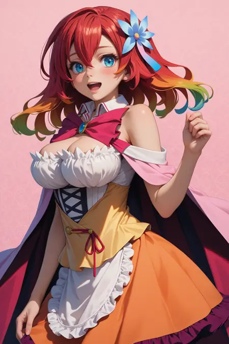 Add "hair flower, detached collar, pink bow, pink cape, bare shoulders, white dress, cleavage, corset, white apron, orange skirt" for her typical look.
