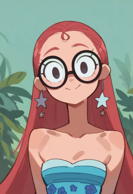 oceanbird, red hair, long hair, glasses, star earrings, blue dress, strapless dress