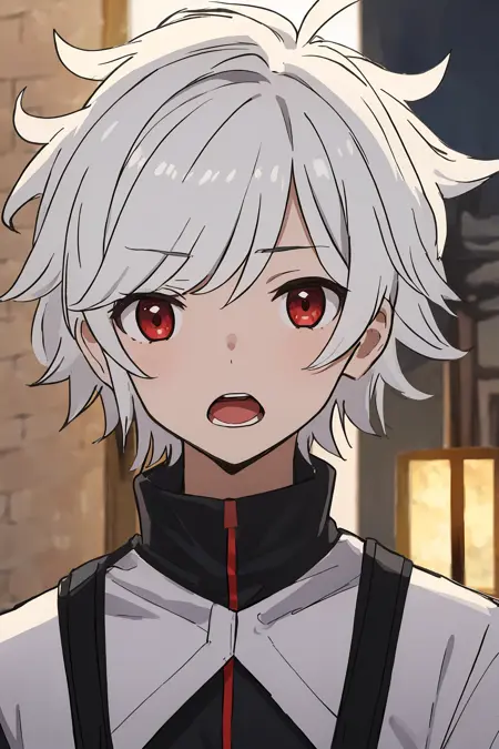 bell cranell, 1boy, solo, looking at viewer, short hair, open mouth, red eyes, upper body, white hair, male focus