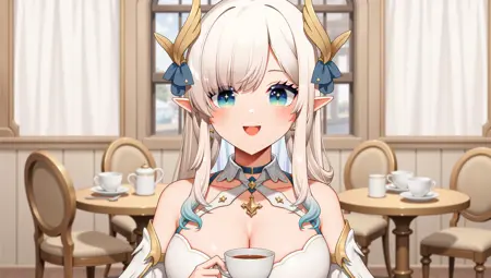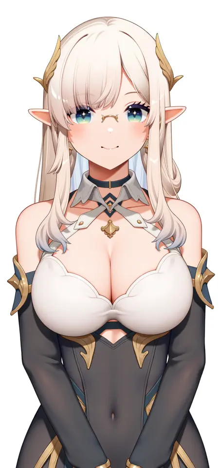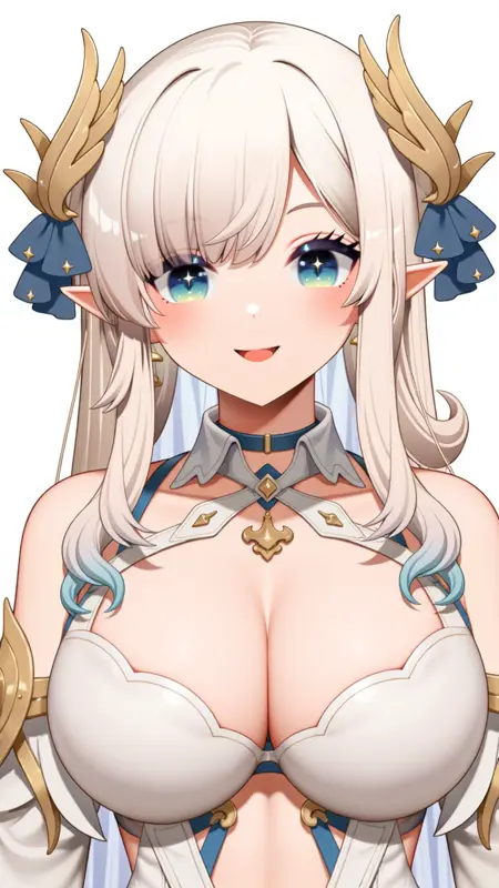 Base prompt: hina, bangs, smile, upper body, cream hair, hair ornaments, large breasts,