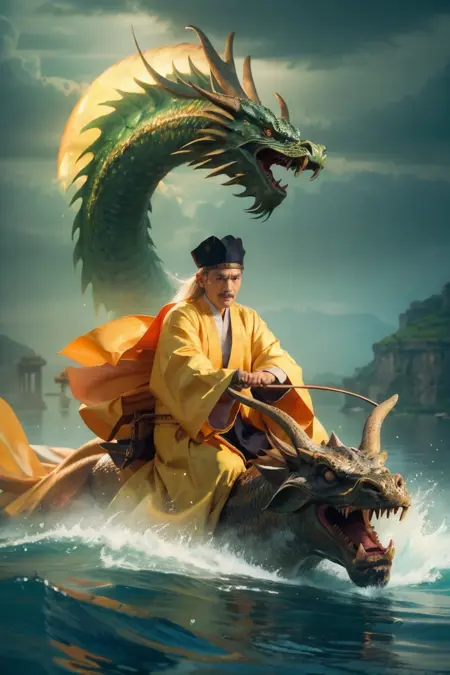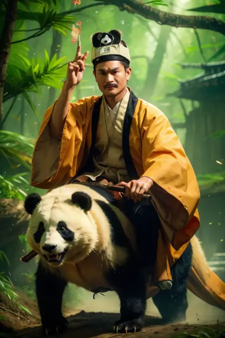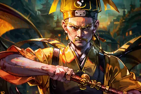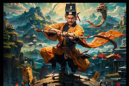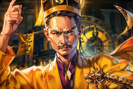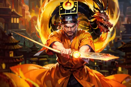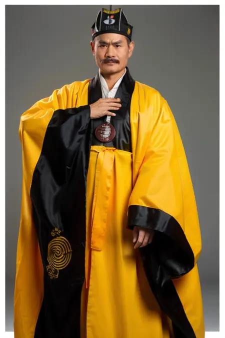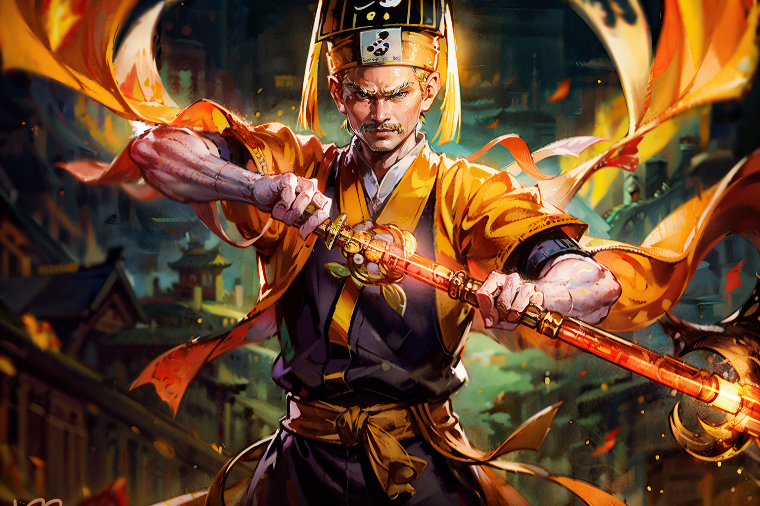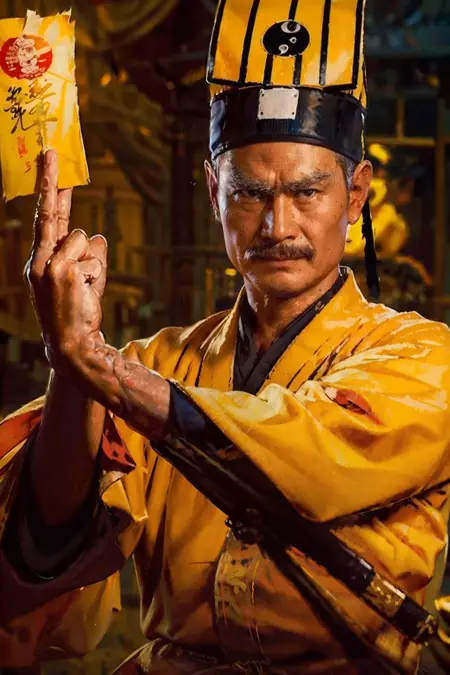 可选提示词(可选): 1boy, black_headwear, coat, robe, holding, fulu, sword, sword_finger