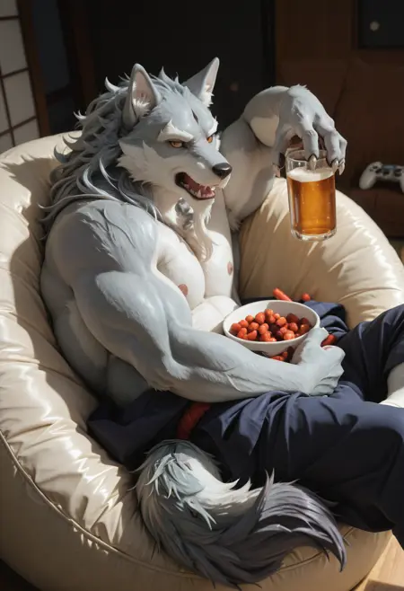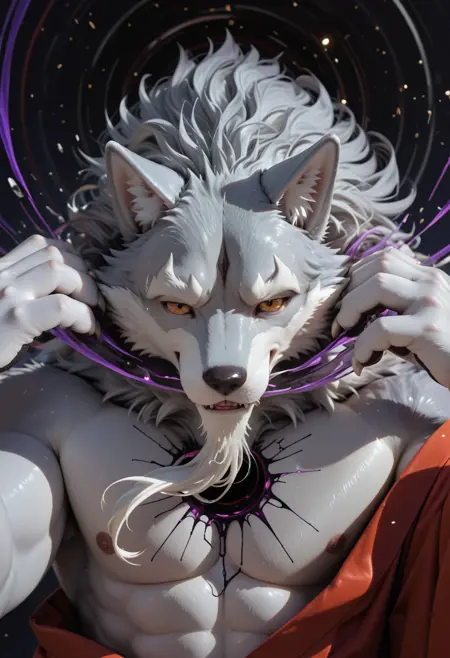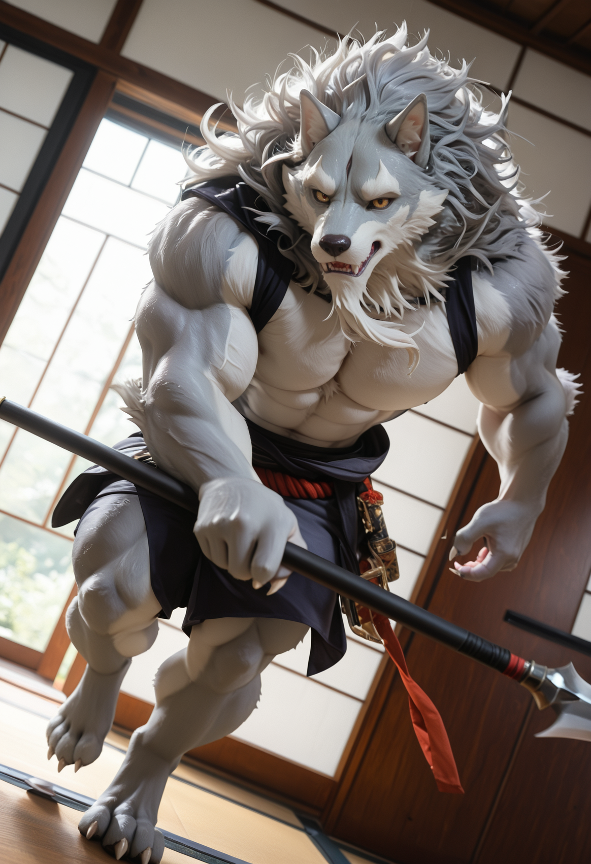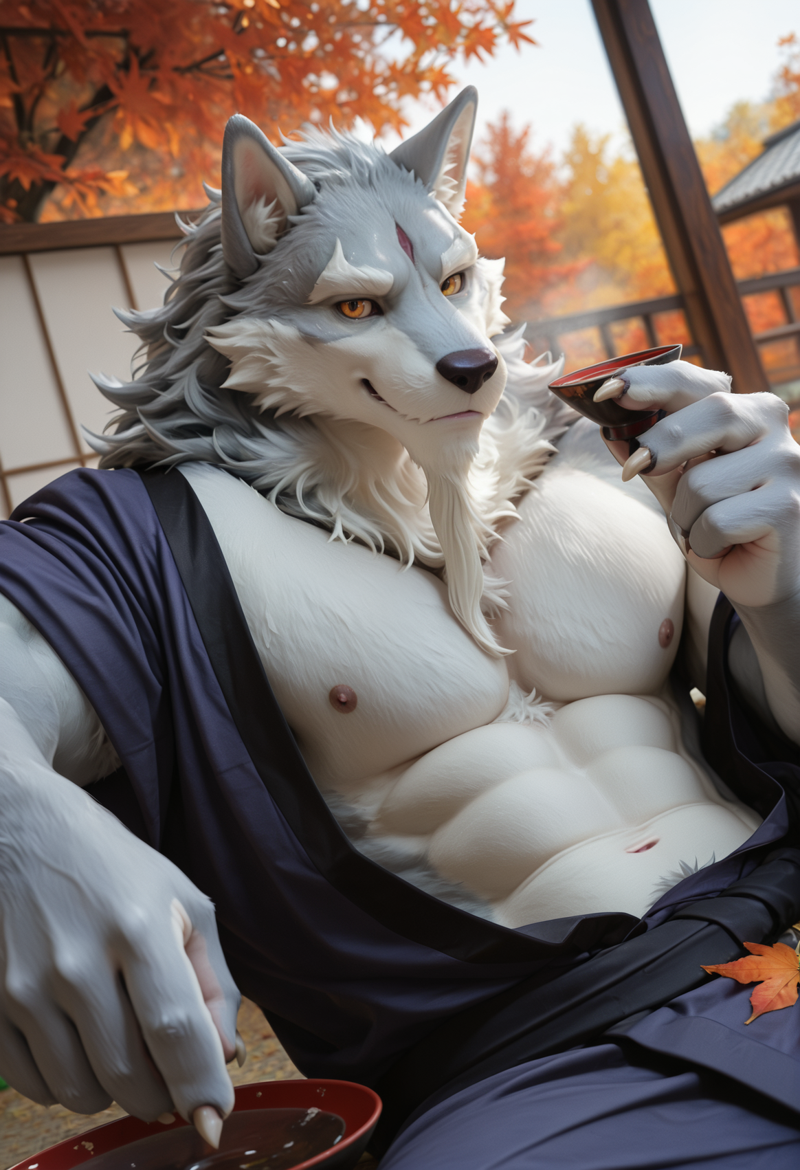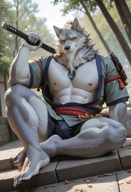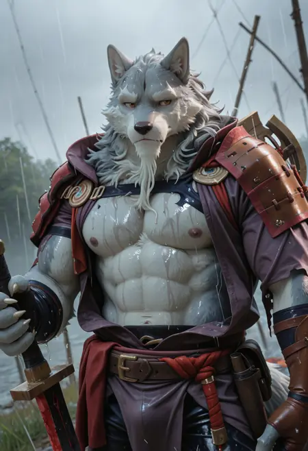// Illustrious: law_sdorica, male focus, furry male, 1boy, solo, muscular, wolf boy, claws, looking at viewer, bare pectorals, grey fur, armor, jewelry, shoulder armor, japanese clothes