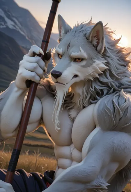 // Pony: law_sdorica, solo, furry male, wolf, grey body, fangs, yellow sclera, sharp teeth, multicolored body, asian clothing, hold staff, nipples