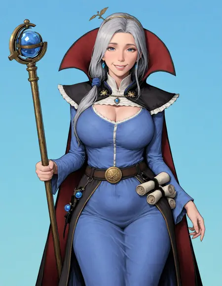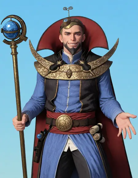 CelestialWizard, cape, high collar, holding weapon, sword, staff,