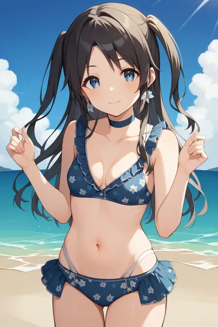 yuikamitsumine, 1girl, solo, black hair, long hair, two side up, blue eyes, small breasts, cleavage, bikini, blue bikini, frilled bikini, bikini skirt, layered bikini, print bikini, floral print, blue choker, flower earrings