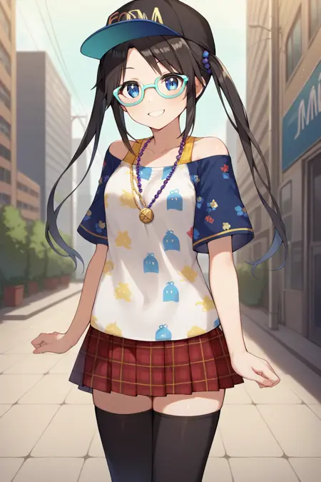 yuikamitsumine, 1girl, solo, black hair, long hair, twintails, hair beads, baseball cap, black headwear, blue eyes, glasses, grey-framed eyewear, white shirt, short sleeves, blue sleeves, print shirt, animal print, t-shirt, off shoulder, off-shoulder shirt, yellow tank top, red skirt, plaid skirt, pleated skirt, miniskirt, black thighhighs, necklace, badge, button badge
