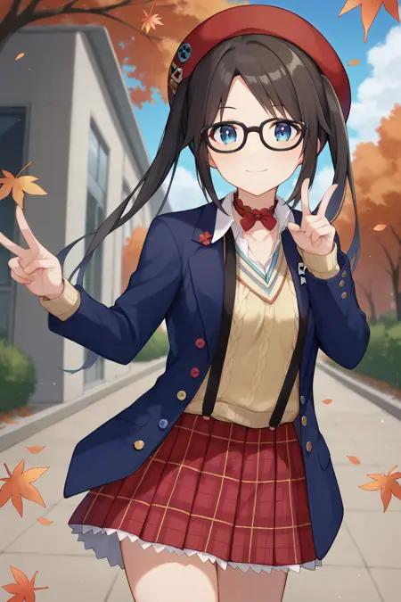 yuikamitsumine, 1girl, solo, black hair, long hair, twintails, beret, red headwear, badge, button badge, blue eyes, glasses, black-framed eyewear, school uniform, blazer, blue jacket, open jacket, yellow sweater, aran sweater, suspenders, red skirt, plaid skirt, pleated skirt, frilled skirt, miniskirt, suspender skirt, red choker, bow choker