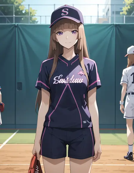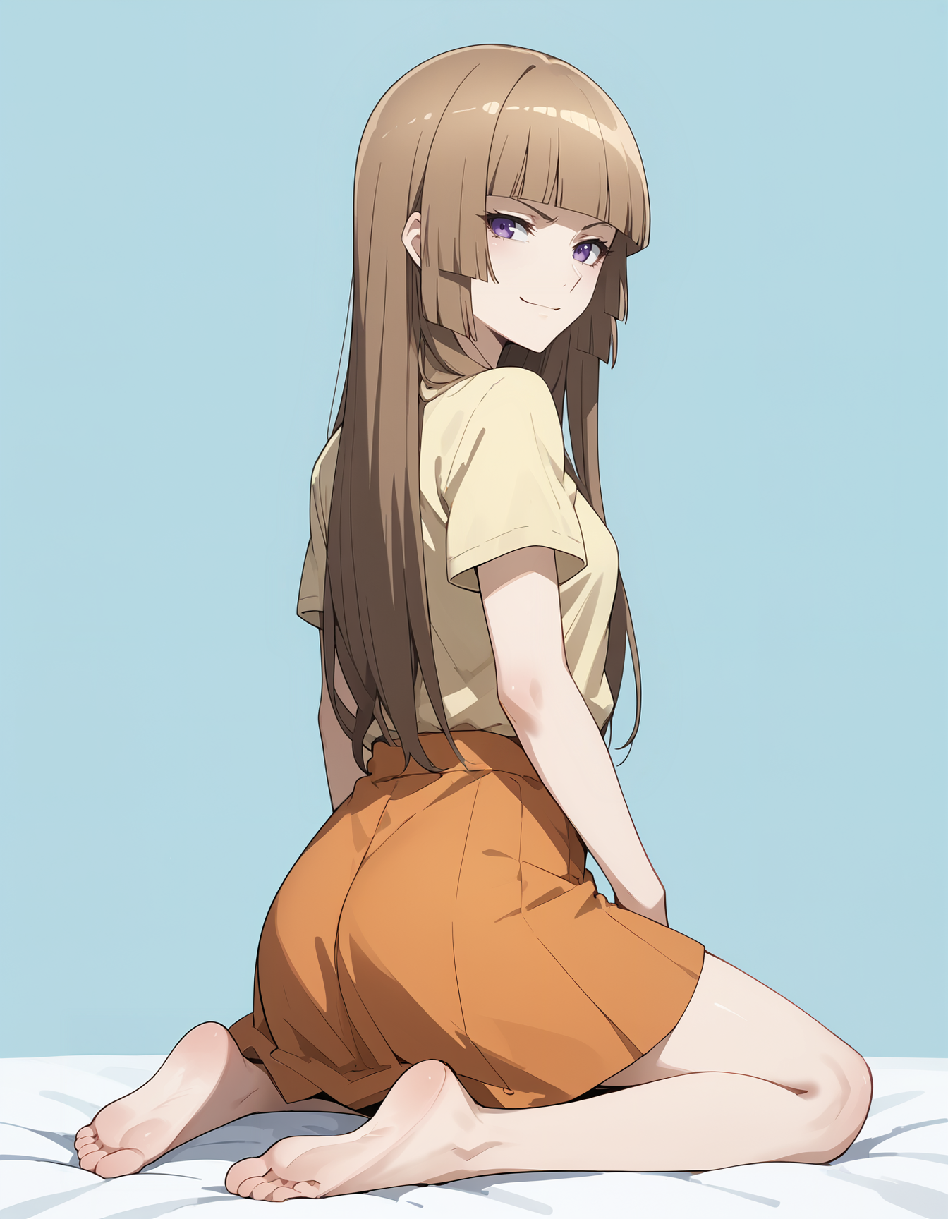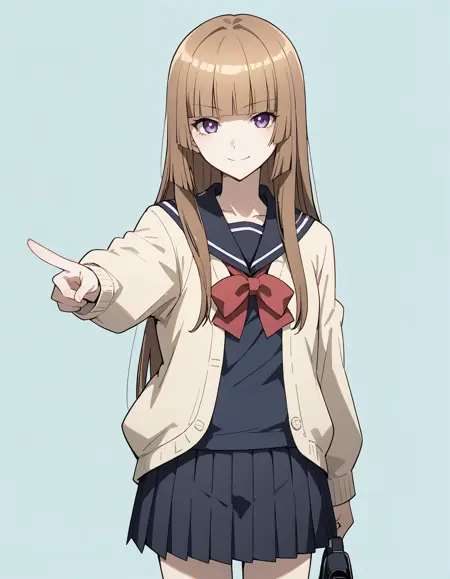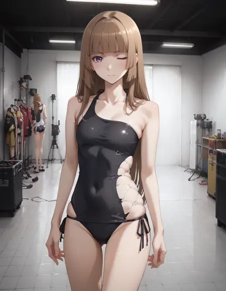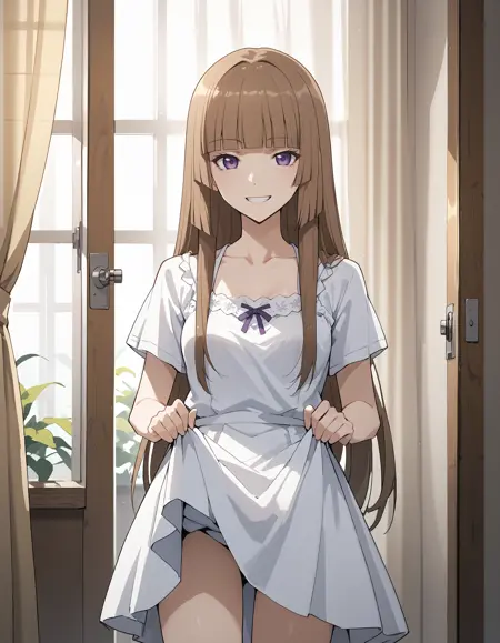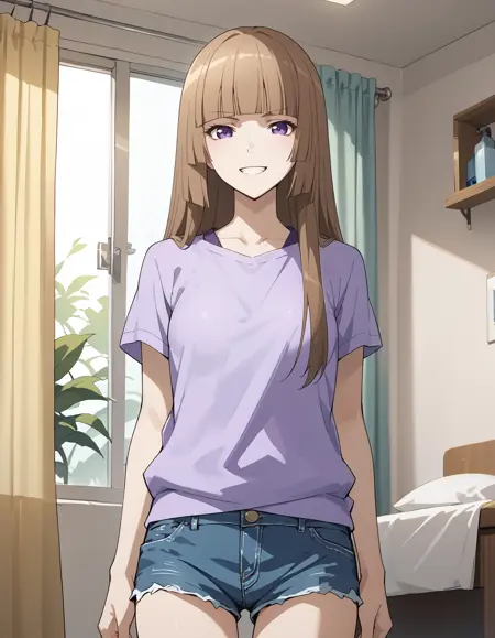 1girl, lora:FuwaAika:1 FuwaAika,brown hair,long hair,blunt bangs,purple eyes,hime cut,small breasts