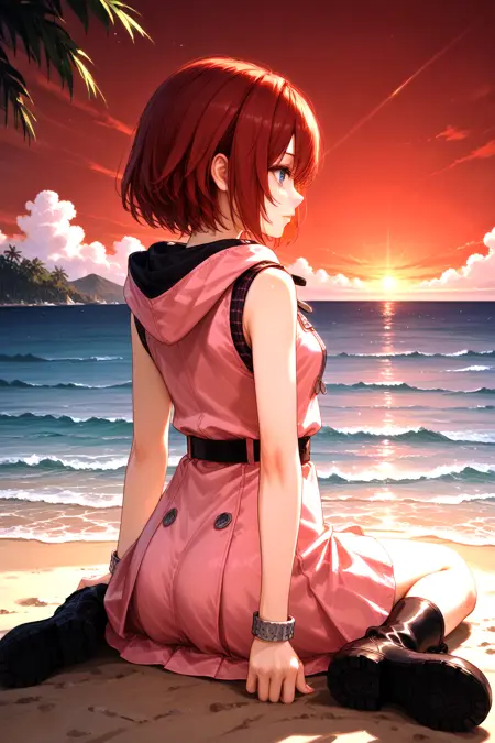 - dress, bare shoulders, jewelry, boots, sleeveless, belt, hood, necklace, black footwear, bracelet, buttons, sleeveless dress, short dress, hood down, pink dress, buckle, zipper, black belt, belt buckle, unzipped, pleated dress, zipper pull tab
