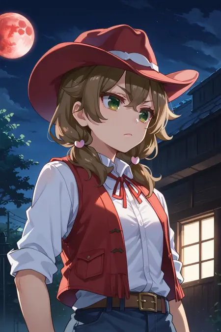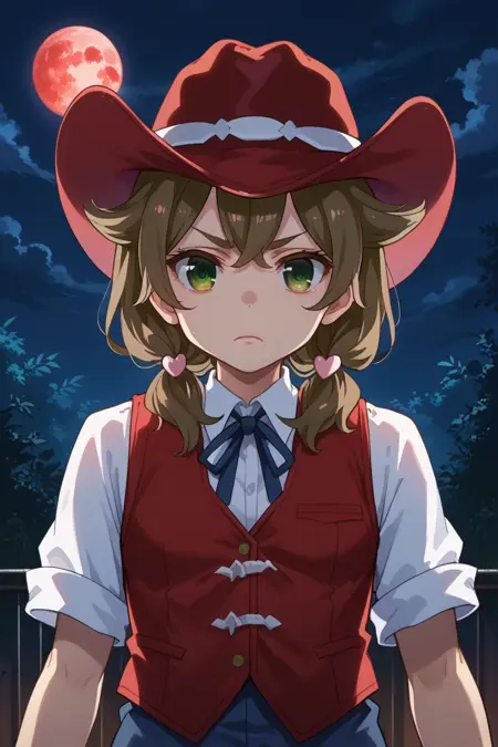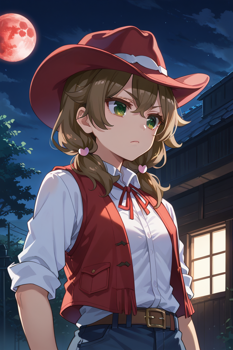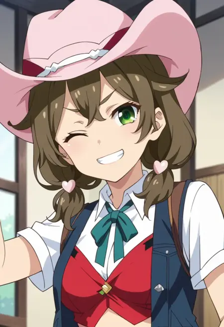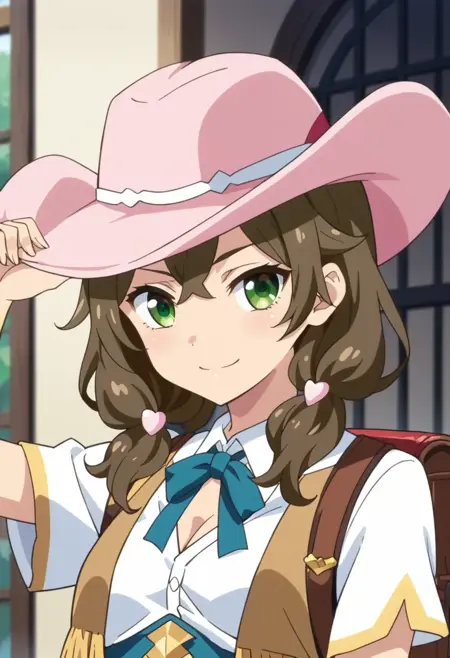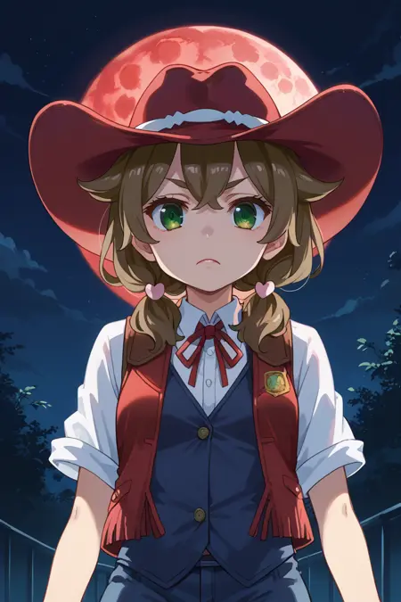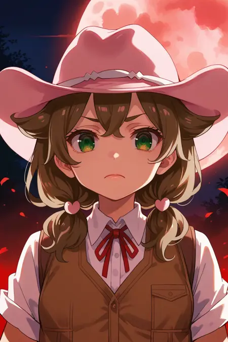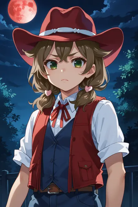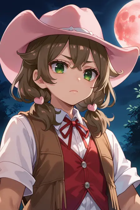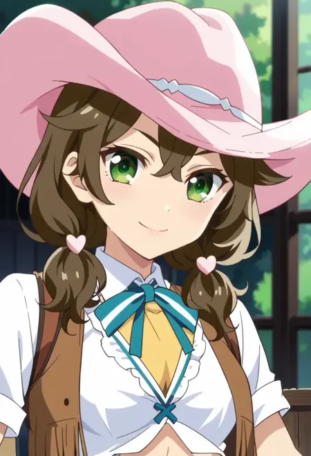 Sakura Meifon, low twintails, green eyes, brown hair, cowboy hat, vest,