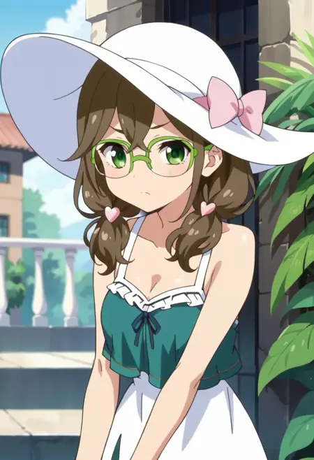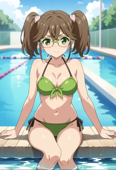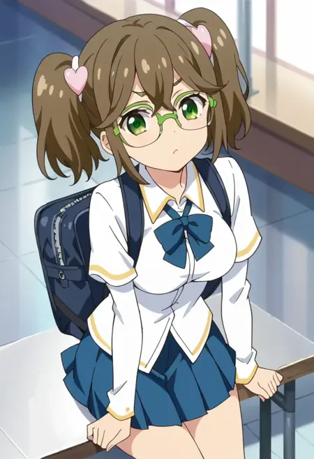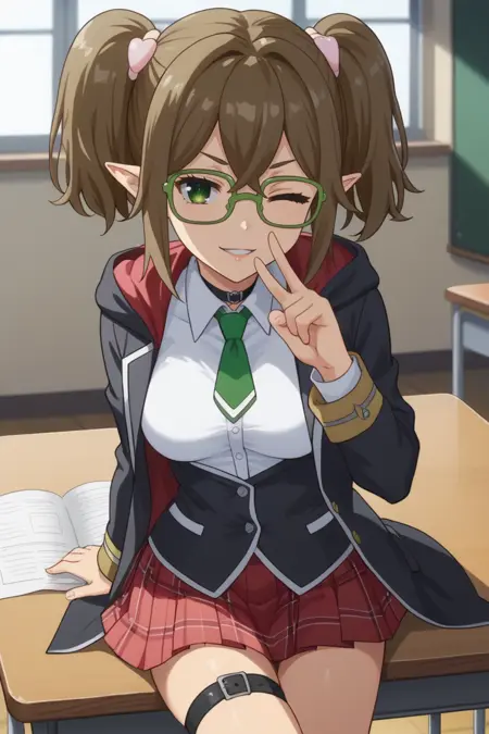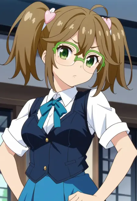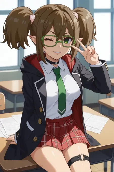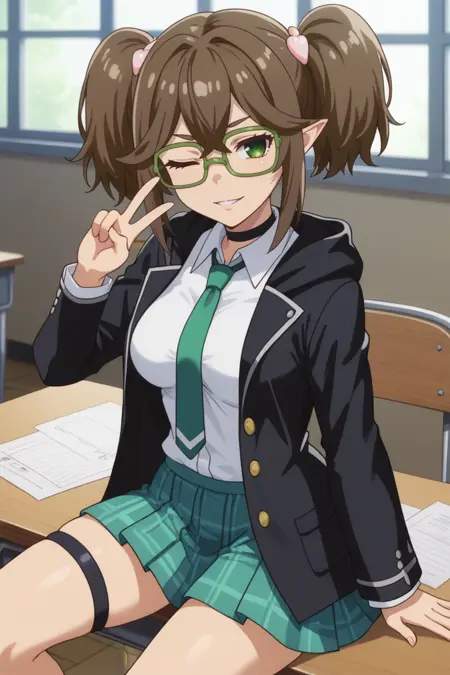 Sakura Meifon, high twintails, green eyes, brown hair, twintails, green-framed eyewear, glasses,