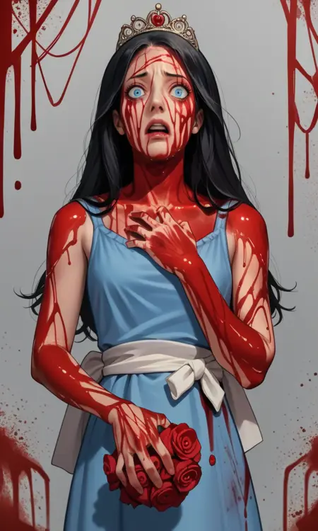 1girl, blood on face,blood on clothes, long dress,sleeveless,tiara, collarbone, shock face expression, sash, holding bouquet