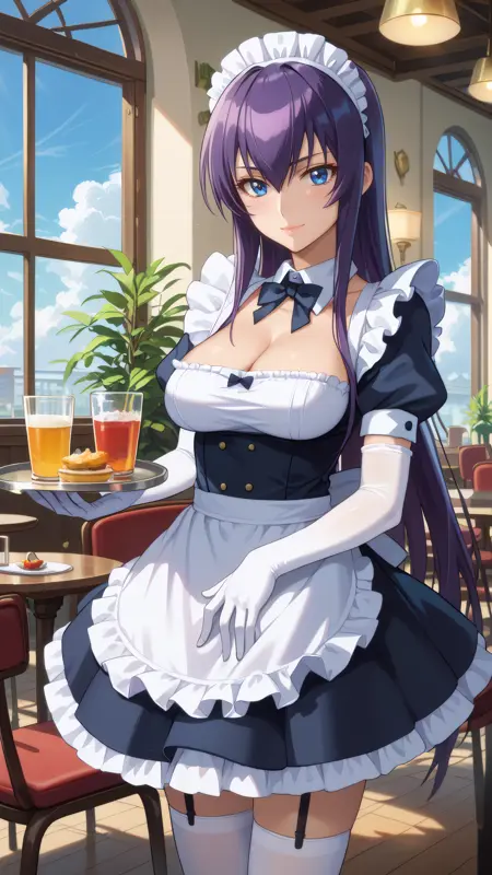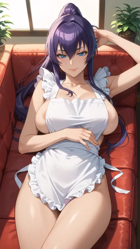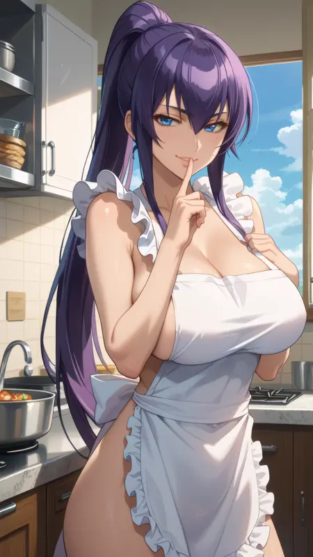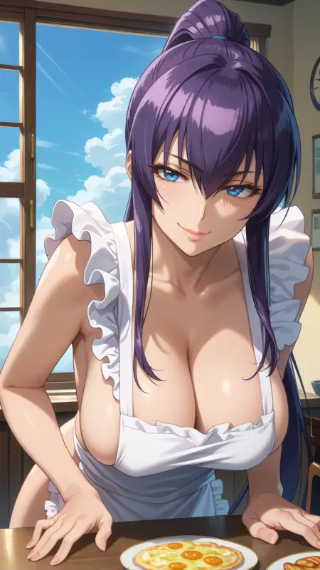 saeko_busujima, 紫色の髪, 青い目, 長い髪, 高いポニテ, 目の間の髪, 裸のエプロン, フリル付きエプロン,