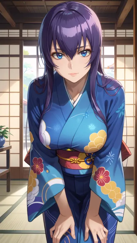 saeko_busujima, 紫色の髪, 青い目, 長い髪, 目の間の髪, 日本衣装, 多色の着物, 帯, しめ, 青い着物, 広い袖,