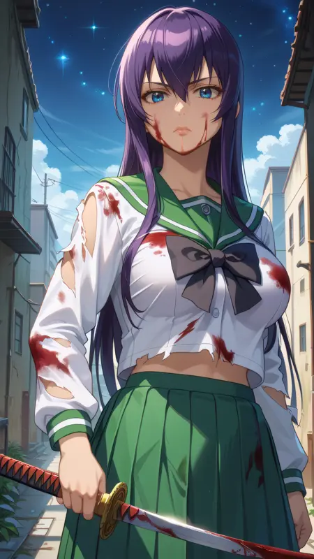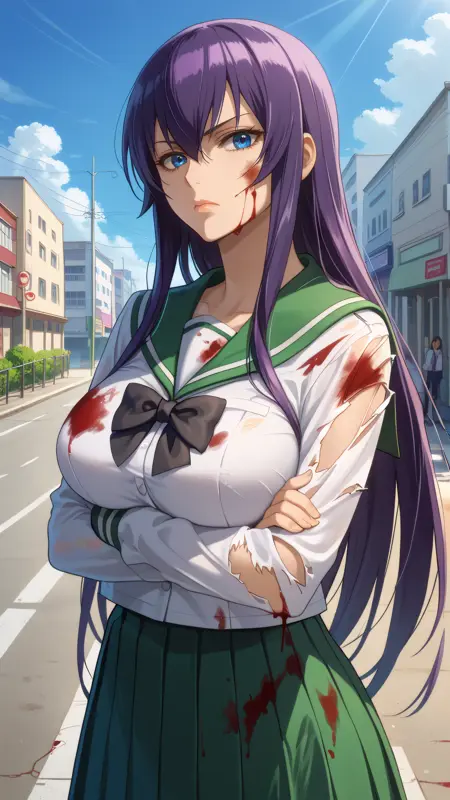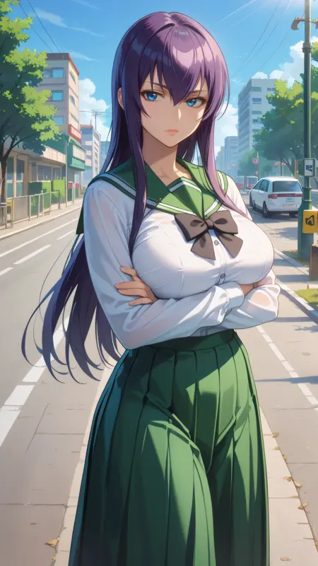 saeko_busujima, 紫色の髪, 青い目, 長い髪, 目の間の髪, 学校制服, セラフク, 緑のスカート, 長いスカート, プリーツスカート, 黒い蝶ネクタイ,