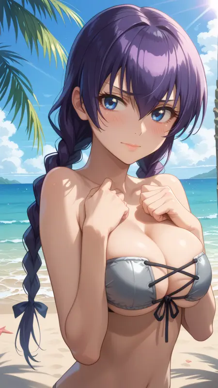 saeko_swimsuit, 青い目, 紫色の髪, 二つ編み, 白いビキニ, 水着, ブラジャーなしビキニ, アンダーブーブ,