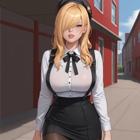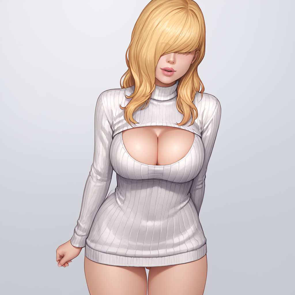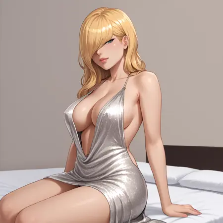 트리거: RachelFoley, 1girl, 큰 가슴, 금발, 바디수트, 배꼽, 흉선, 검은 장갑, 긴 머리, 벨트, 지퍼, 벌린 지퍼, 입술, 주머니, 머리카락이 눈을 가림, 한쪽 눈을 가린 머리카락, 카우보이 샷