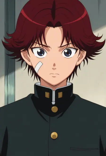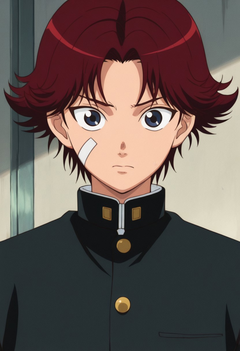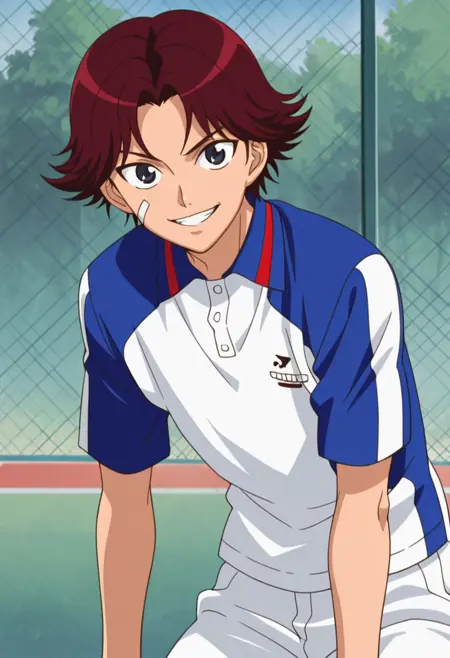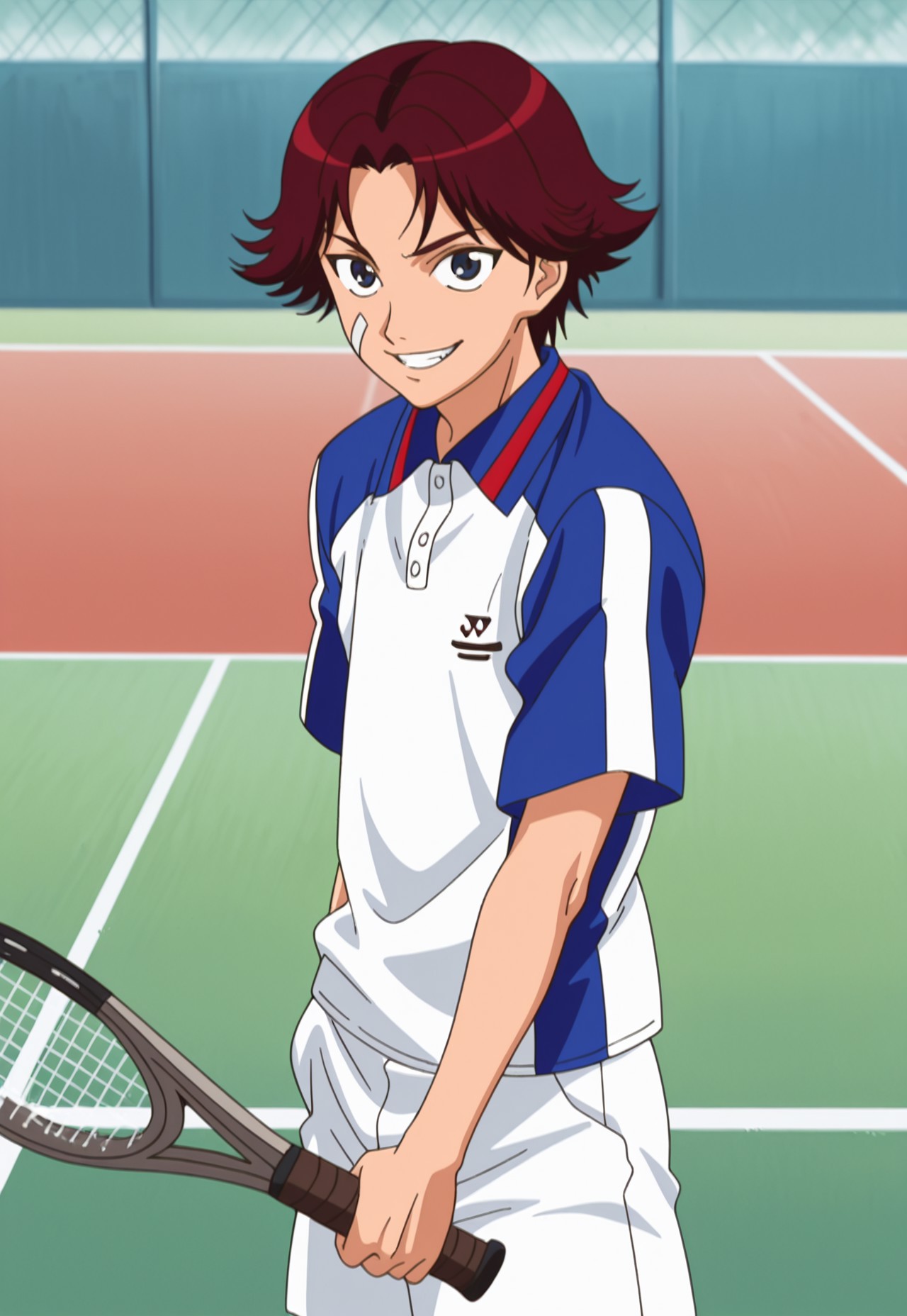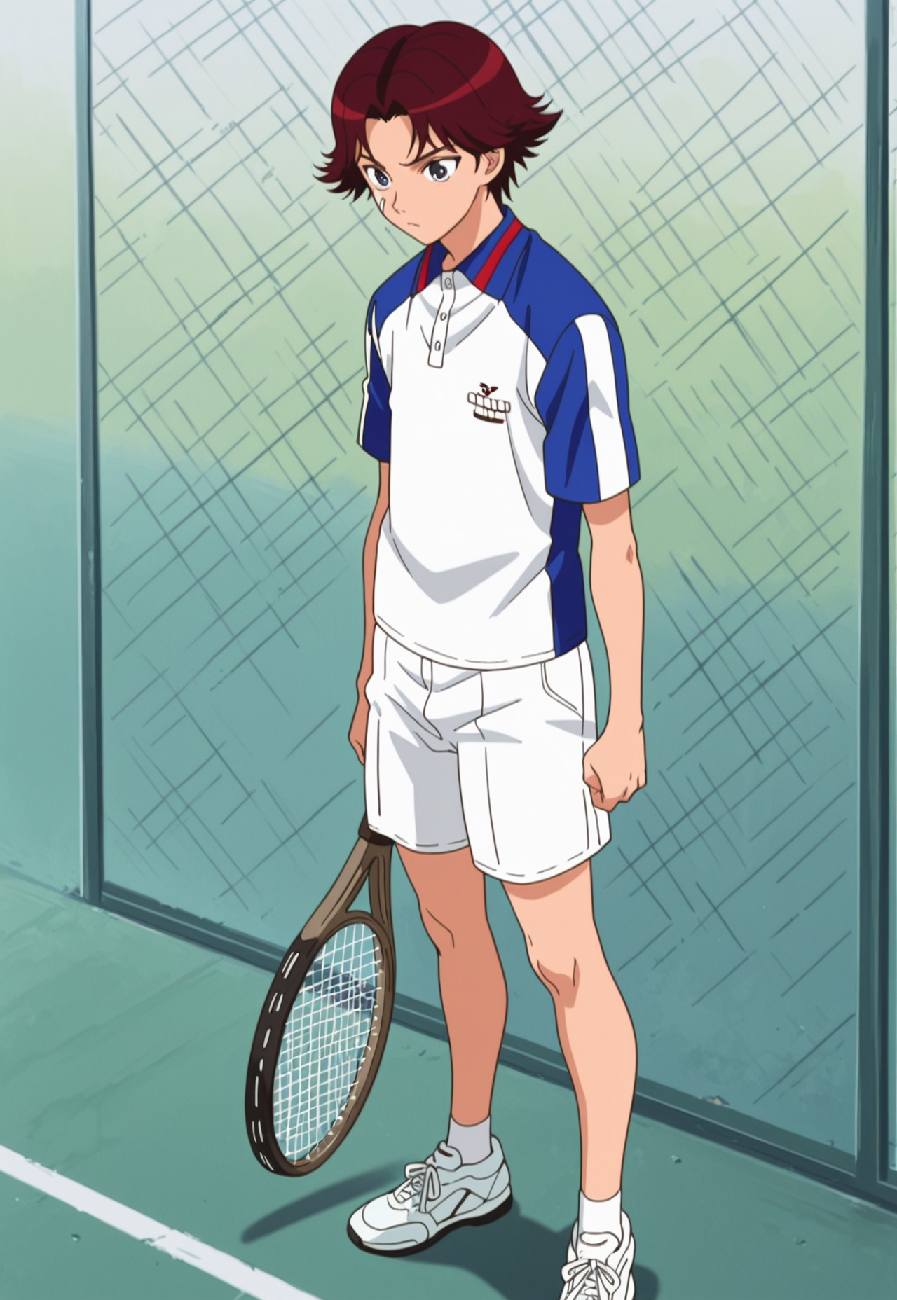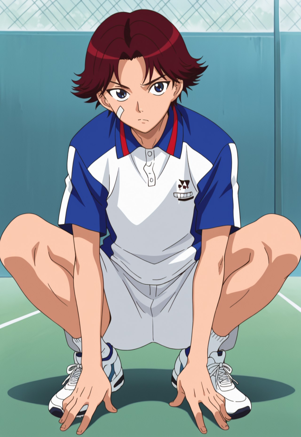 1boy, male focus, solo, red hair, parted bangs, blue eyes, bandaid on cheek, tennis uniform, polo shirt, white and blue shirt, short sleeves, raglan sleeves, white shorts, white socks, sneakers,