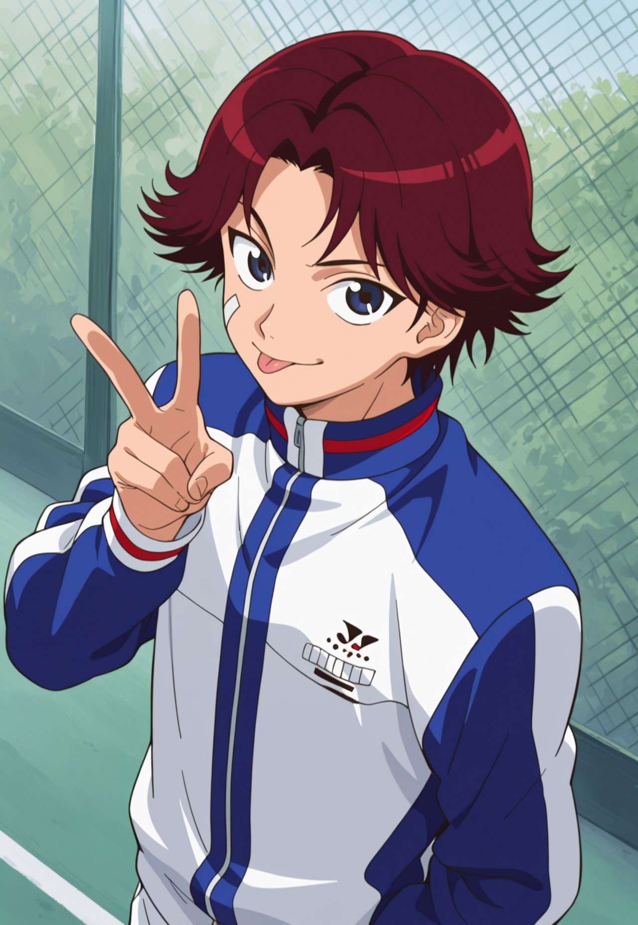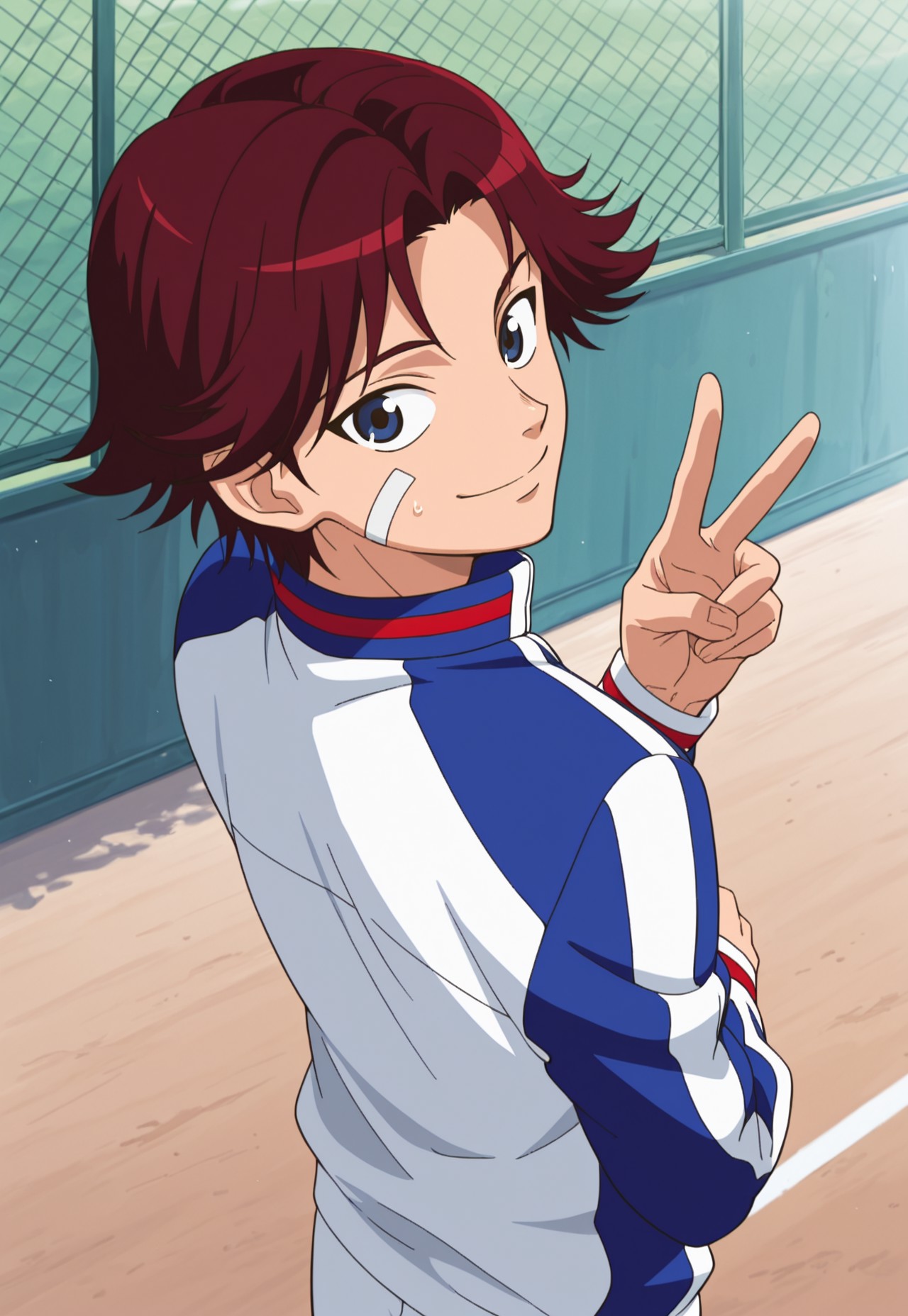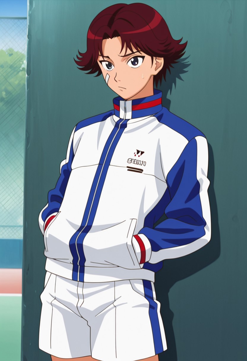 1boy, male focus, solo, red hair, parted bangs, blue eyes, bandaid on cheek, tennis uniform, track jacket, white and blue jacket, white shorts, white socks, sneakers,