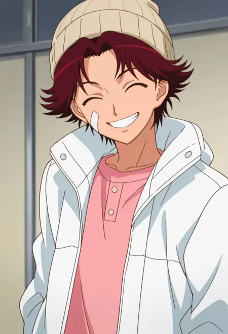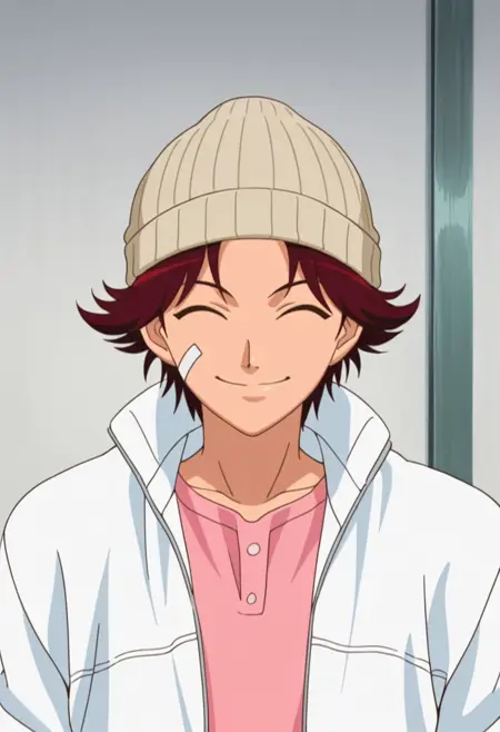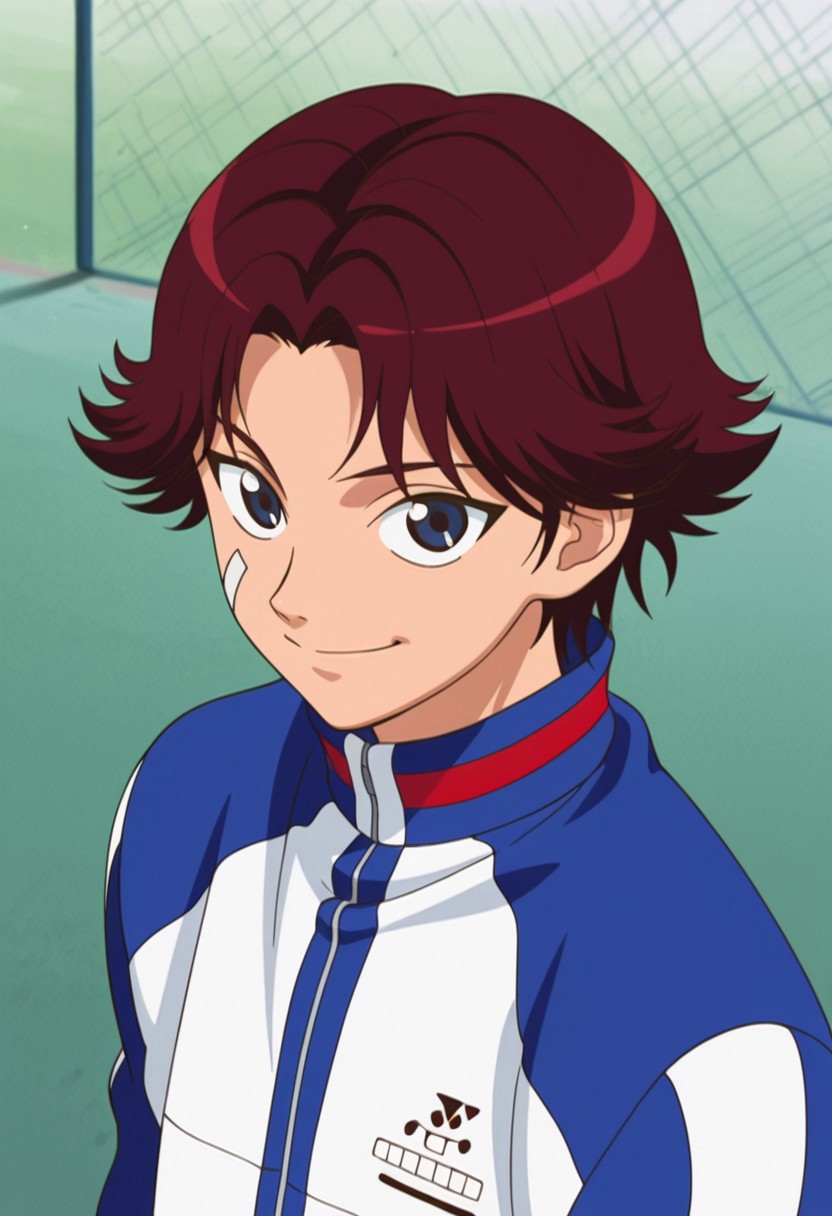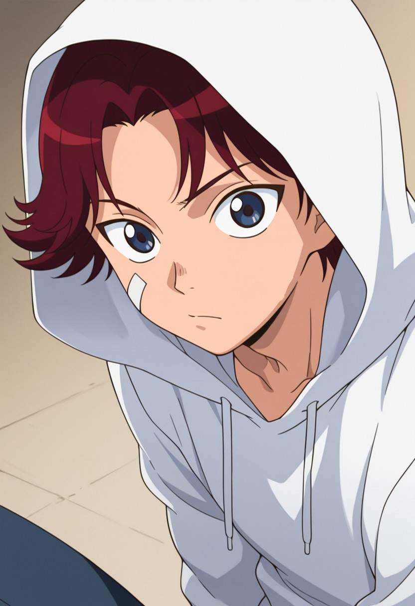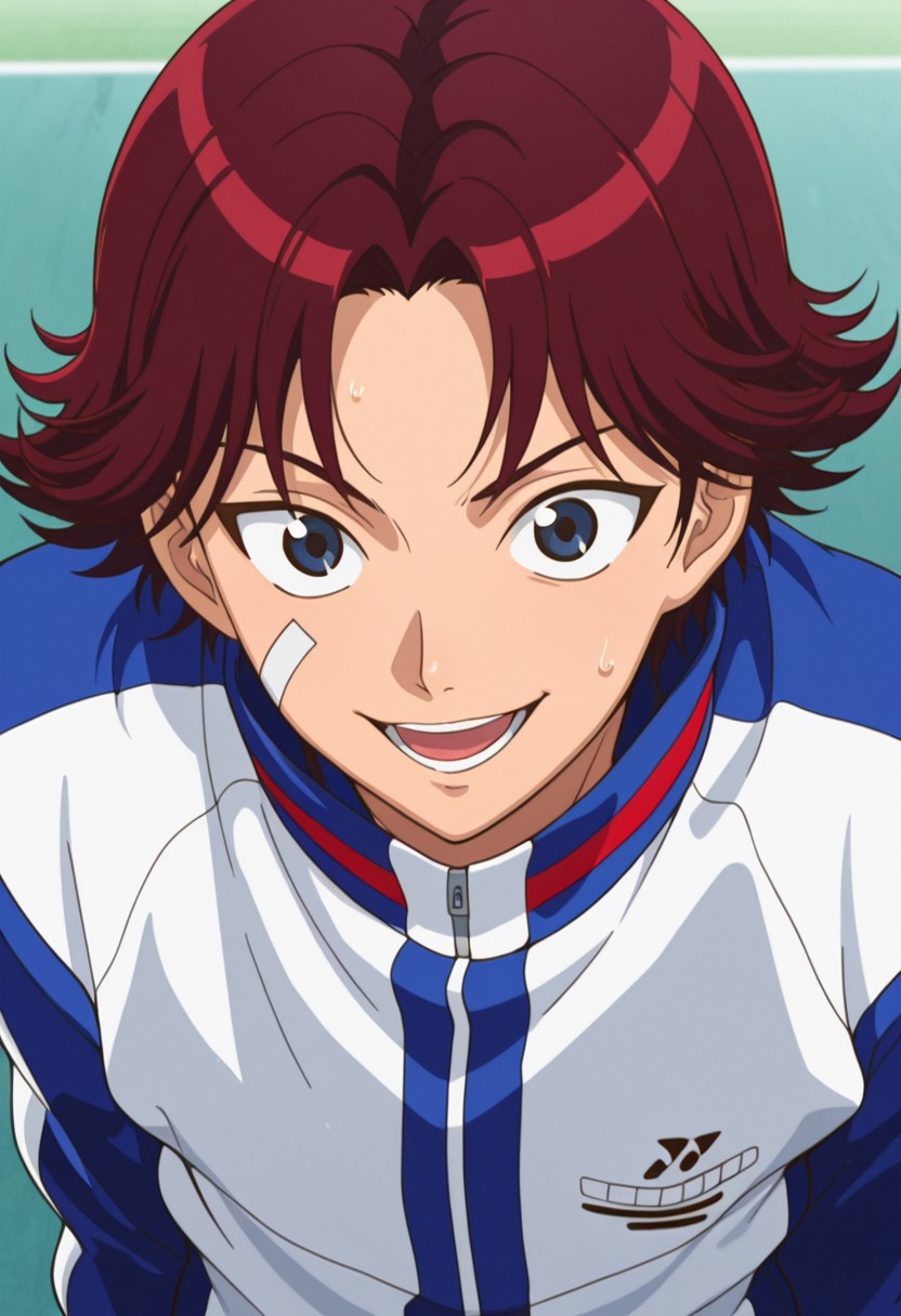 1boy, male focus, solo, red hair, parted bangs, blue eyes, bandaid on cheek, tennis uniform, track jacket, white and blue jacket, white shorts, white socks, sneakers,