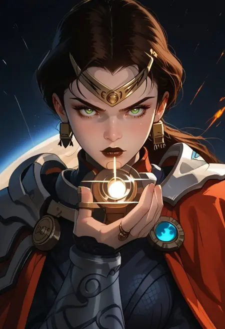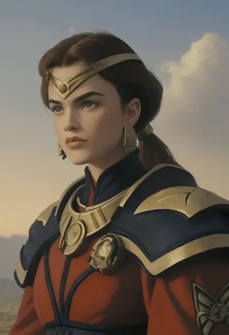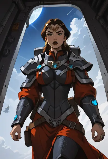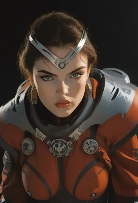 フルアウトフィットはトリガーワード「Marlena_BA」のみで使用できますが、追加のトリガー「1girl, battle armor, 長い茶色の髪、ポニーテール、緑の目、イヤリング」で指定することもできます。