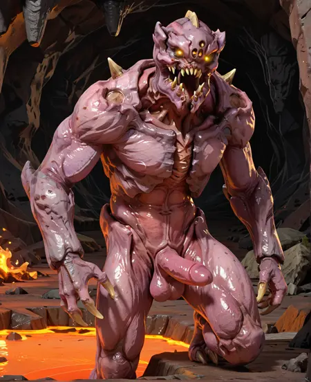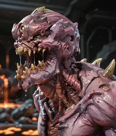 태그: prowler, demon, doom, horror, horror (theme), monster, bones, claws, spikes, glowing eyes, split jaw, sharp teeth, pink skin, shiny skin, exoskeleton, segmented body, shoulder spikes, four fingers, three eyes, extra eyes, etc...