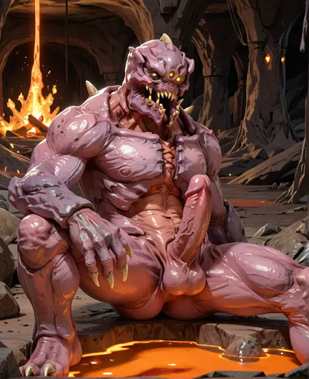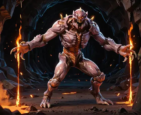 Tags: prowler, demon, doom, horror, horror (theme), monster, bones, claws, spikes, glowing eyes, split jaw, sharp teeth, pink skin, shiny skin, exoskeleton, segmented body, shoulder spikes, four fingers, three eyes, extra eyes, etc...