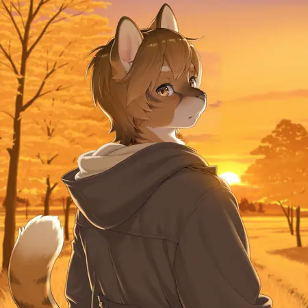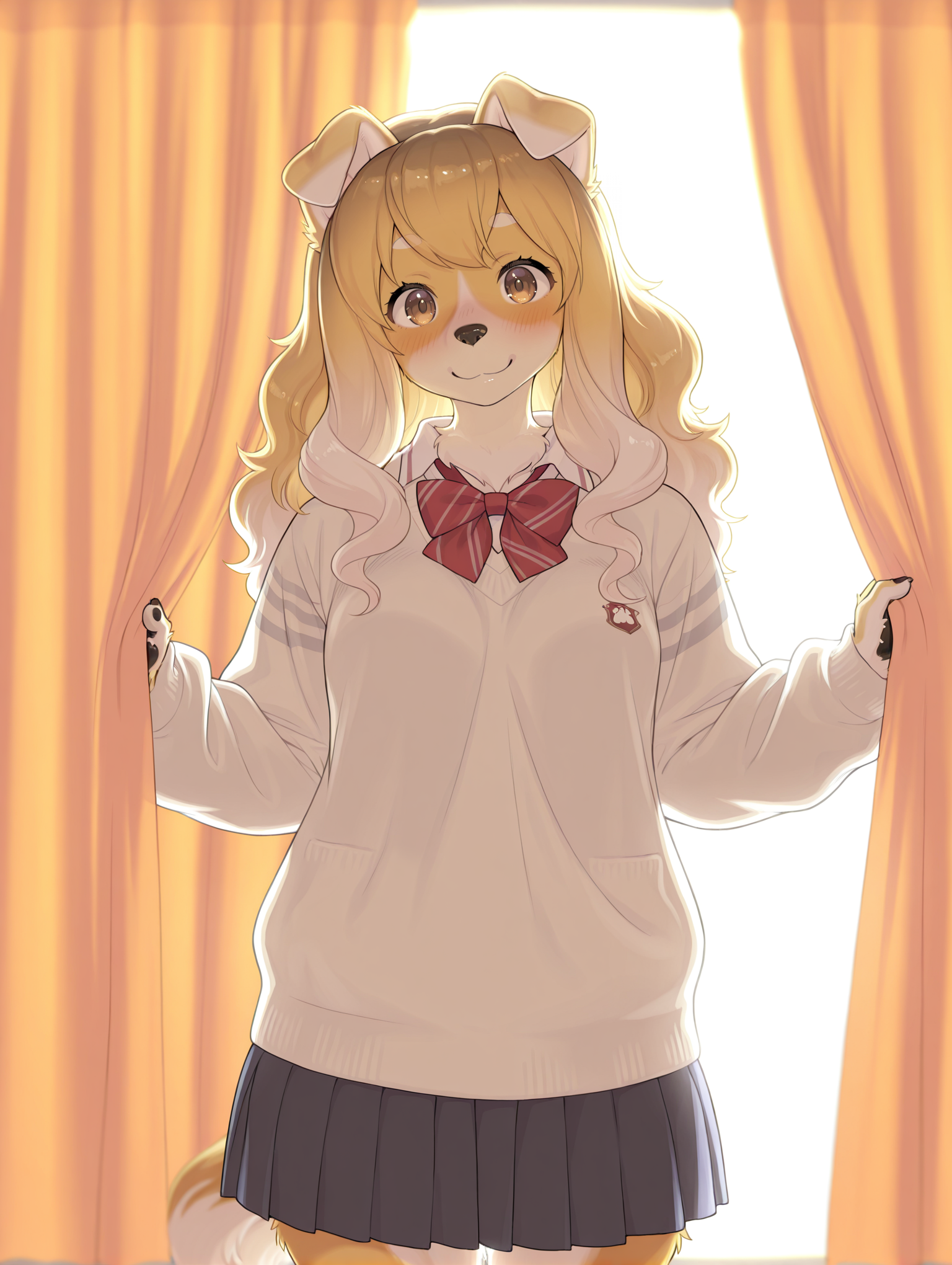by kikurage, koriyama meiko, furry, anthro, female, canid, canine, canis, domestic dog, black nose, black pawpads, brown body, brown fur, brown ears, brown hair, long hair, neck tuft, pawpads, paws, tuft, two tone body, two tone ears, two tone fur, white body, white claws, white fur, white hair, white inner ear, tail