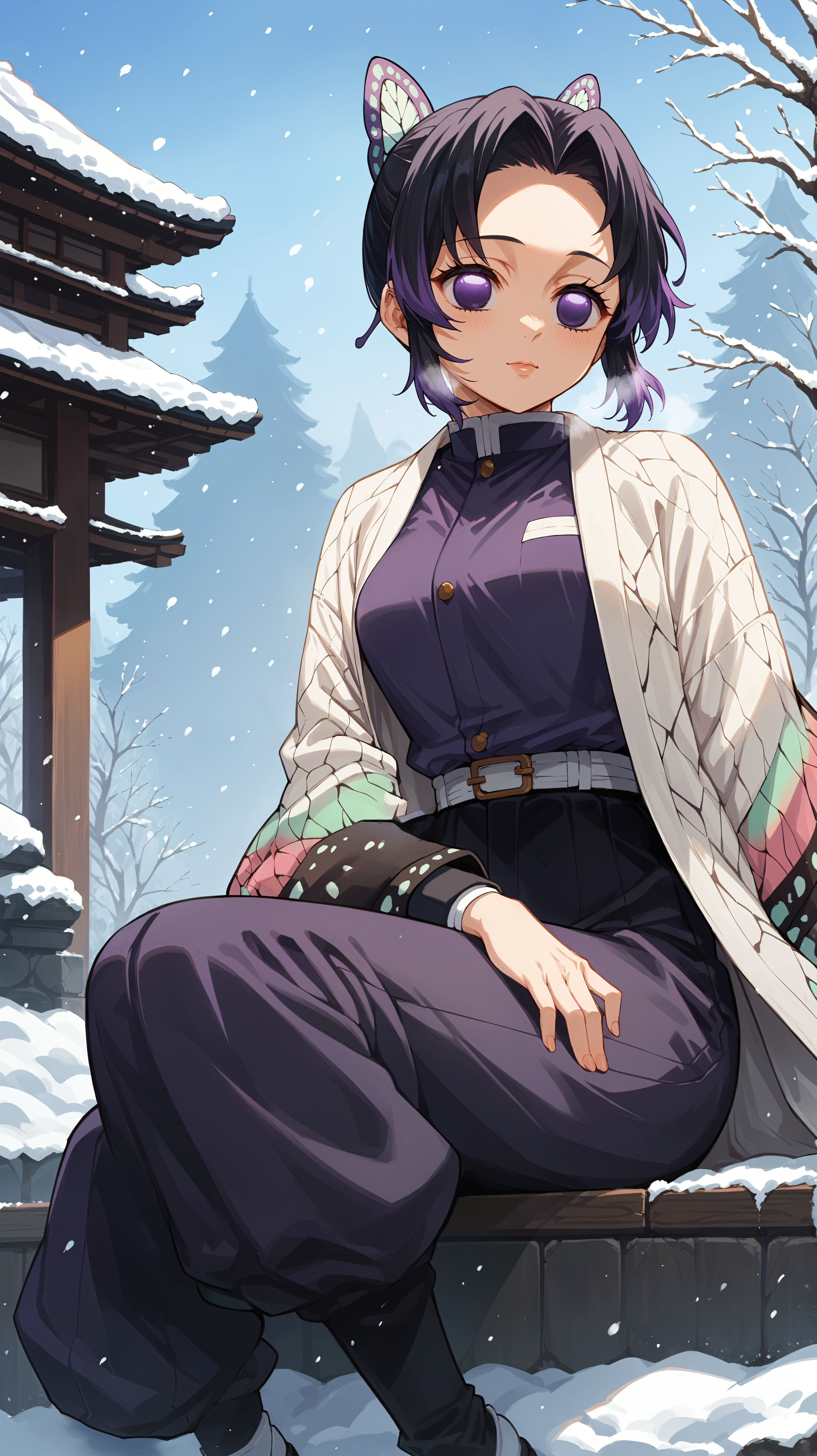 black hair, purple hair, short hair, multicolored hair, purple eyes, empty eyes, japanese clothes, purple shirt, purple pants, white coat, butterfly print, butterfly hair ornament, hair ornament
