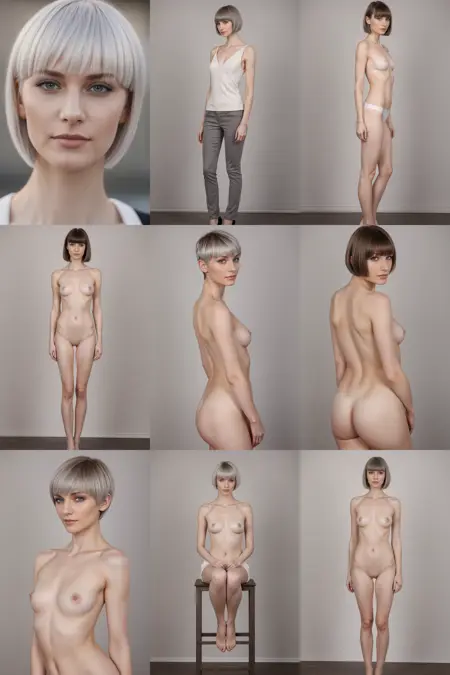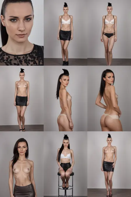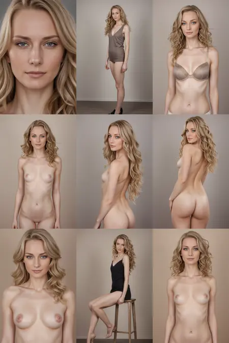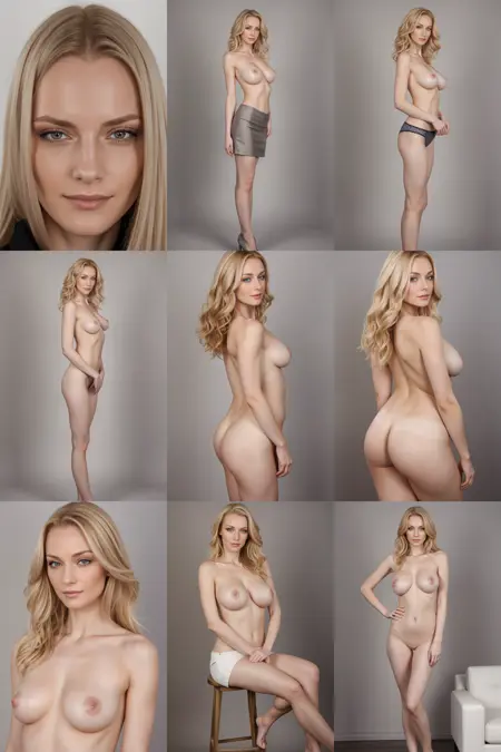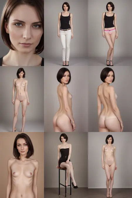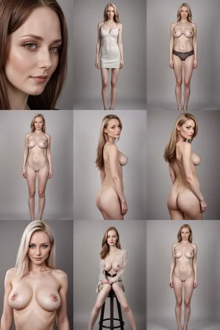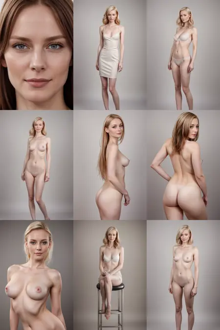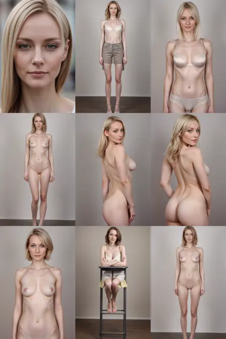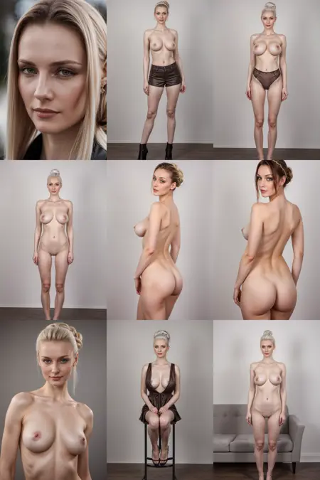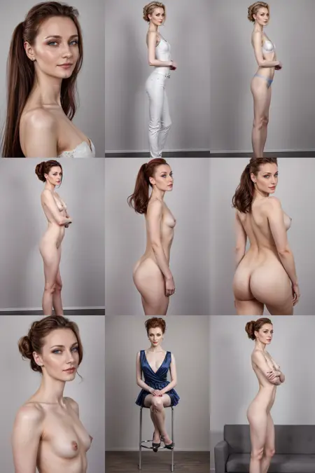 {close-up, portrait, | full body, standing, arms by side, clothed female | full body, standing, arms by side, underwear only| full body, standing, arms by side, pussy, completely nude | from side, ass, completely nude | from behind, ass, looking back, completely nude| upper body, completely nude, nipples,| sitting on a high chair stool, | full body, standing, arms by side, pussy, completely nude, sofa, casting, lights, cameras | full body, standing, arms by side, clothed female, from side }