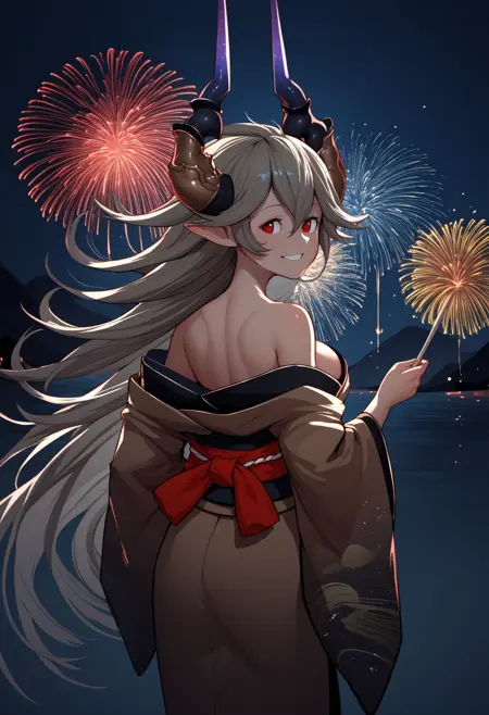 Default Outfit: threodef, long hair, grey hair, horns, pointy ears, red eyes, white cape, armor, sleeveless, black gloves, elbow gloves, red skirt, miniskirt, black thighhighs, armored boots, large breasts