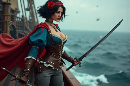 Images created using Flux, but trained for Pony, this LoRa will depict every part of a pirate ship (includinding the bilge if that's what you're into) with this sexy pirate version of Minaya in them.