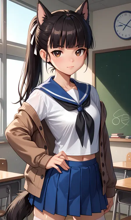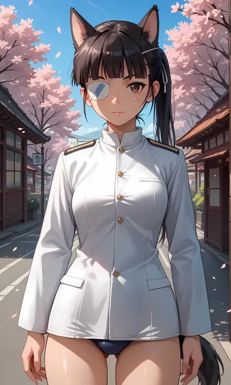 mio,棕色眼睛,眼罩,黑发,齐刘海,马尾辫,白色丝带,发带,狗耳朵,狗尾巴